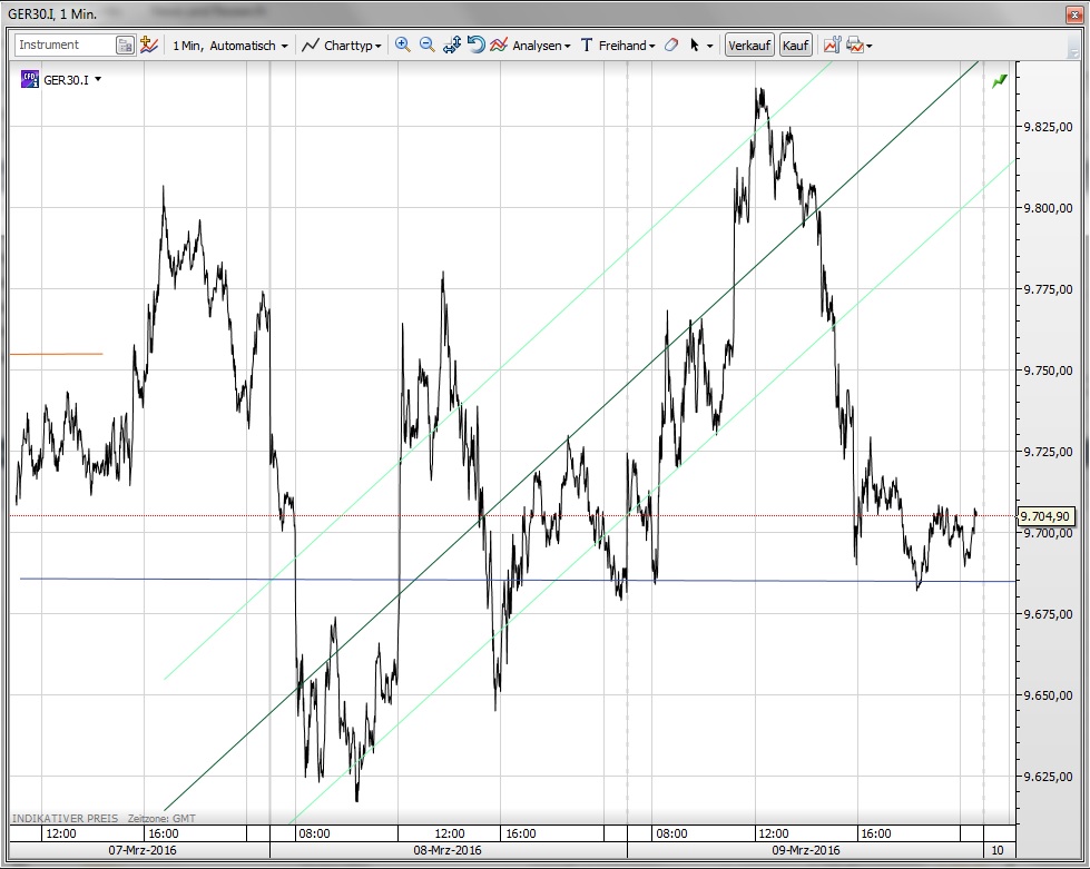 wie weit ist der gelaufen (9885 = + 750 Pkt.) und wo liegen bestimmte Unterstützungs (9685) /Widerstandslinien (9885)